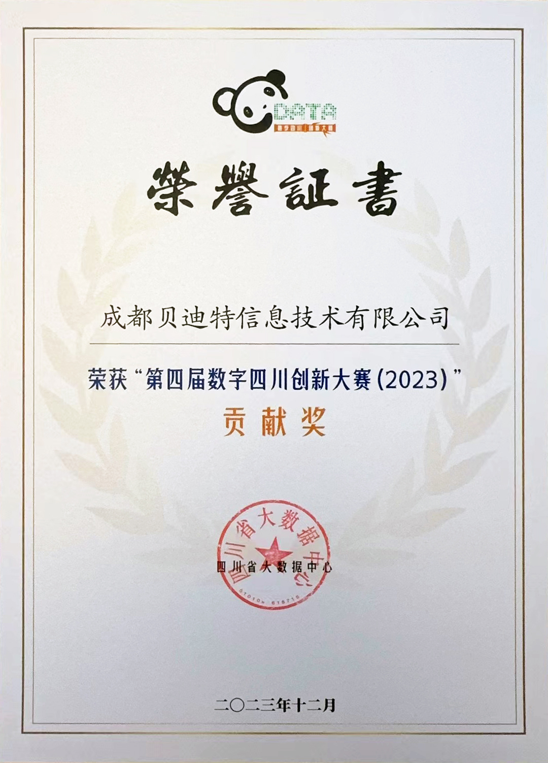 很荣幸贝迪特能在此次大赛中获得“第四届数字四川创新大赛(2023)”贡献奖,贝迪特未来将不断提升产品研发创新能力,为各行业提供更具创新性、实用性、先进性的解决方案,以更优质的产品与服务为四川数字经济发展贡献力量!