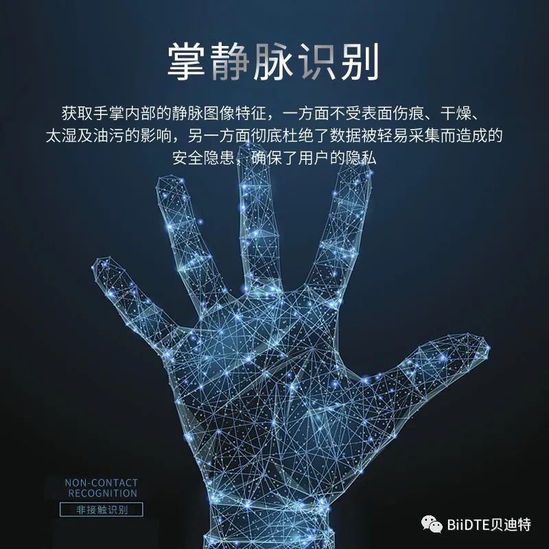 贝迪特掌静脉识别技术认假率<0.00001%, 拒真率小于<0.01%,识别准确率极高。