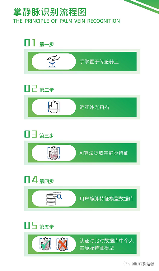 掌静脉识别技术在国内发展前景广阔,因其具有高精度、高安全性、高稳定性等优点,目前已被广泛应用于金融、医疗、政务、公安司法等领域。贝迪特专注于掌静脉识别技术研发,最新一代HandID算法,识别速度小于0.3s,误识别率小于十亿分之一,属业内顶尖!
