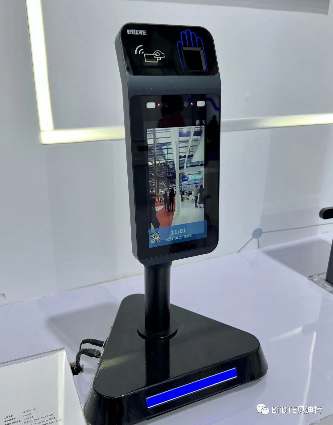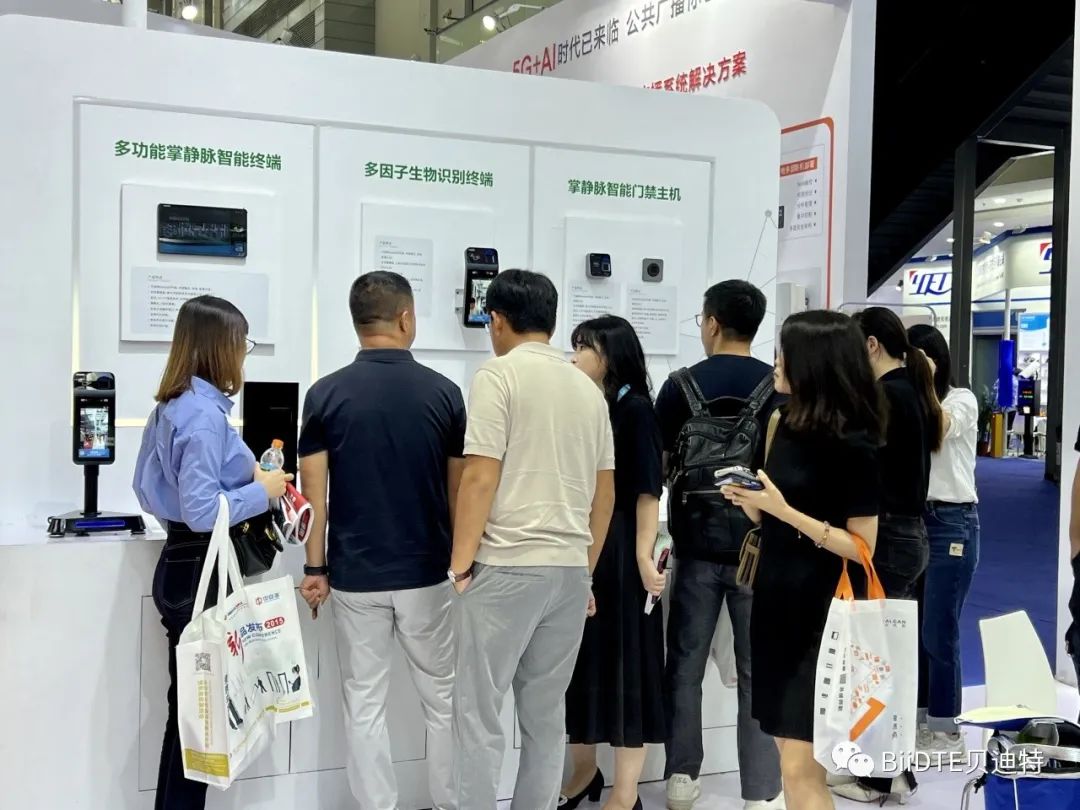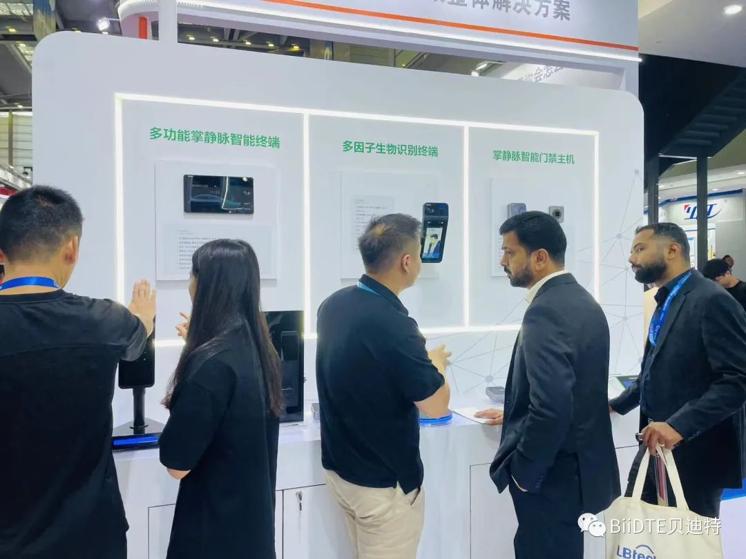 同时,在本次展会中,贝迪特重点展示最新上市的掌静脉识别产品,搭载最新HandID算法的多因子生物识别终端MF97。可同时支持掌静脉识别、人脸识别及IC卡三种识别方式,支持在线、离线认证模式,可实现0.7秒快速认证。质感的机身加新颖的识别方式在展会现场吸引了行业内外众多企业和专家争相参观、体验。